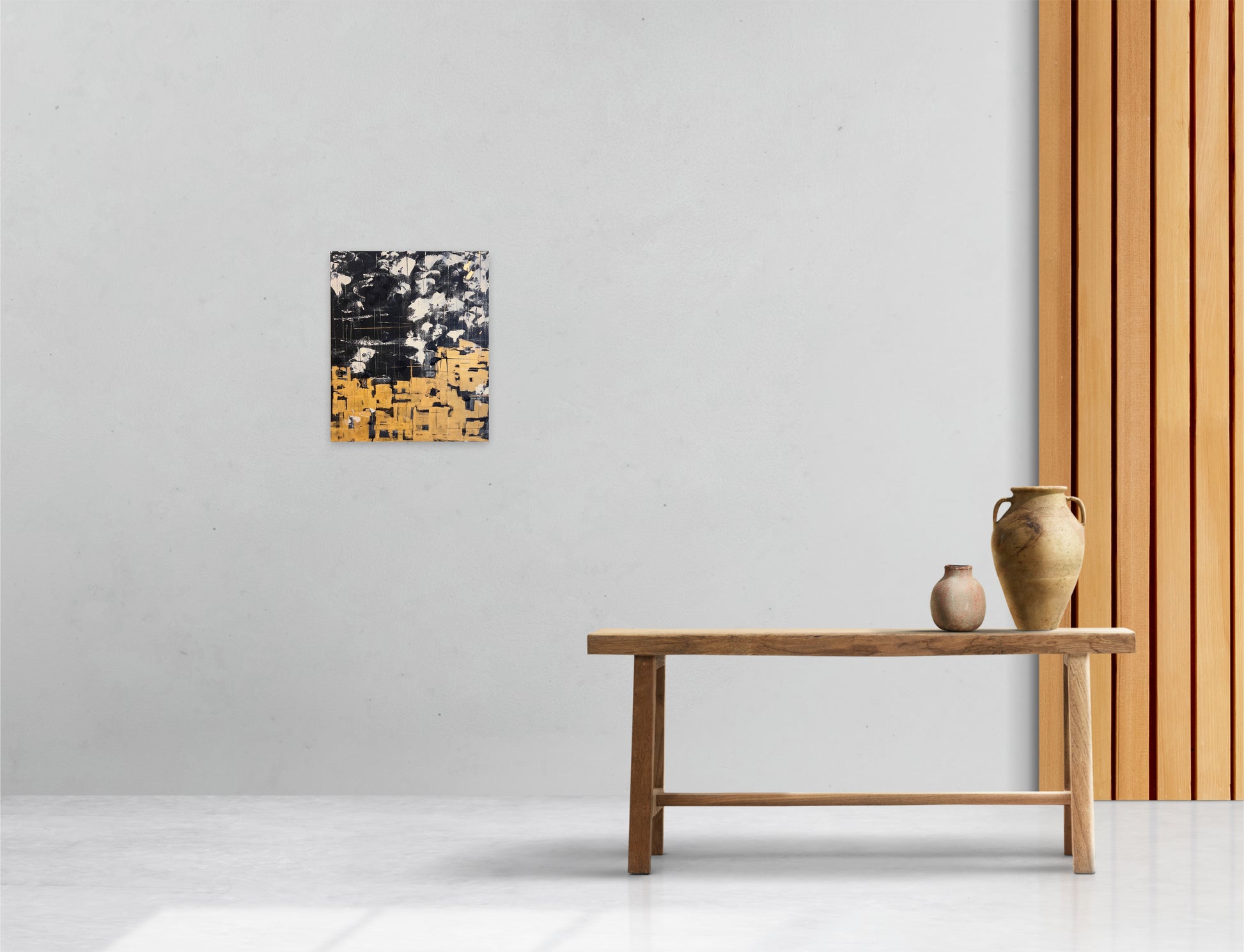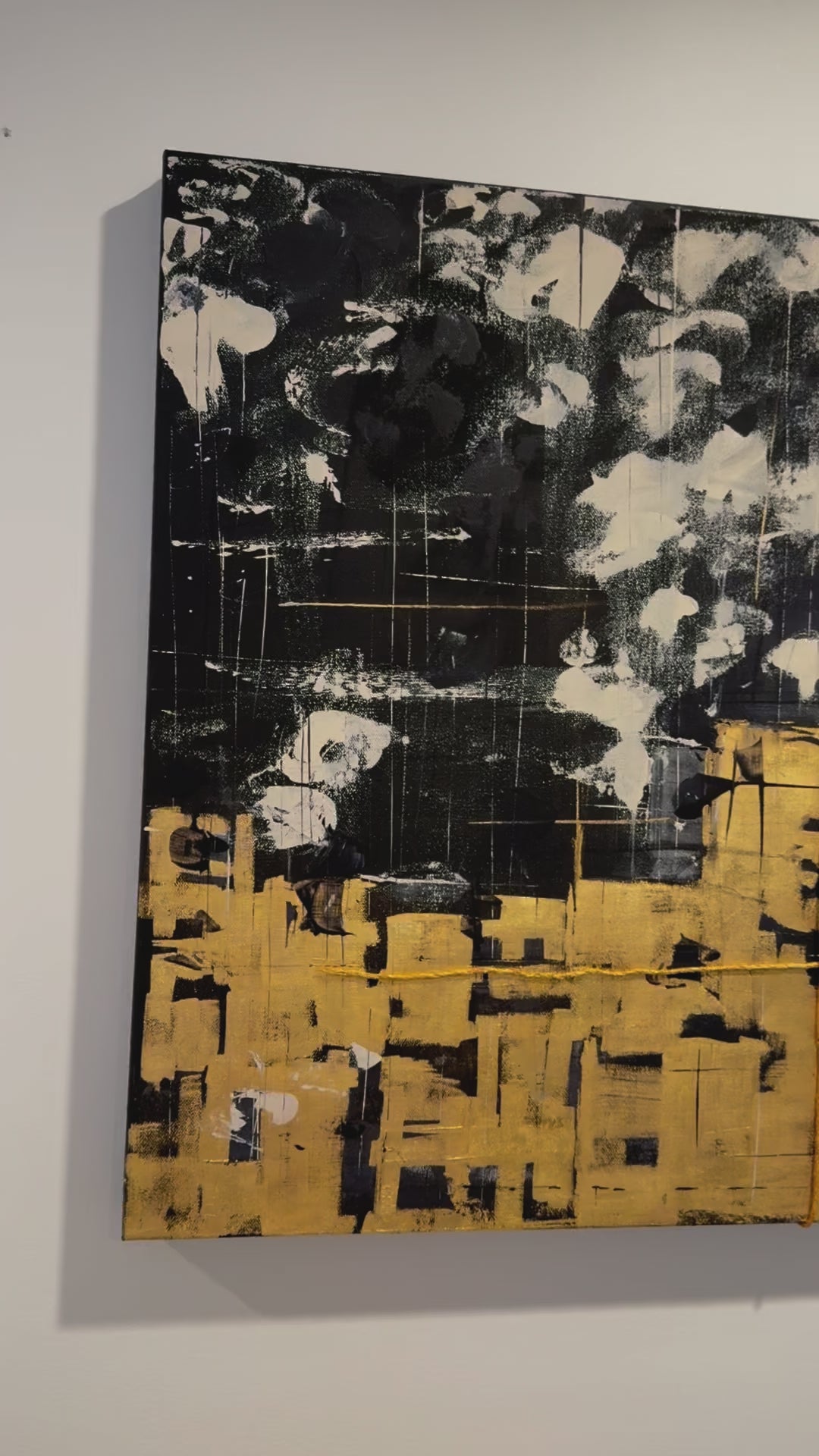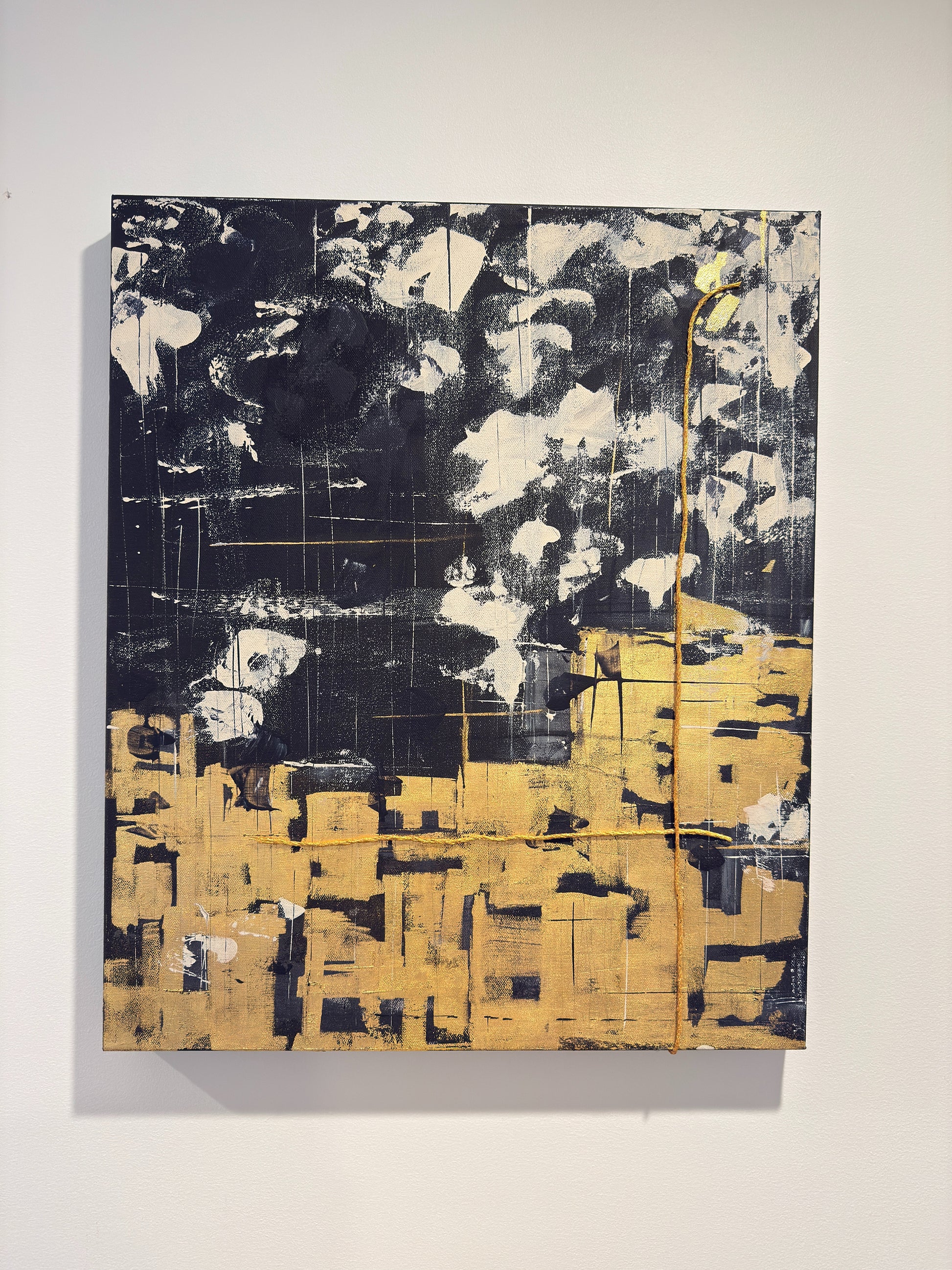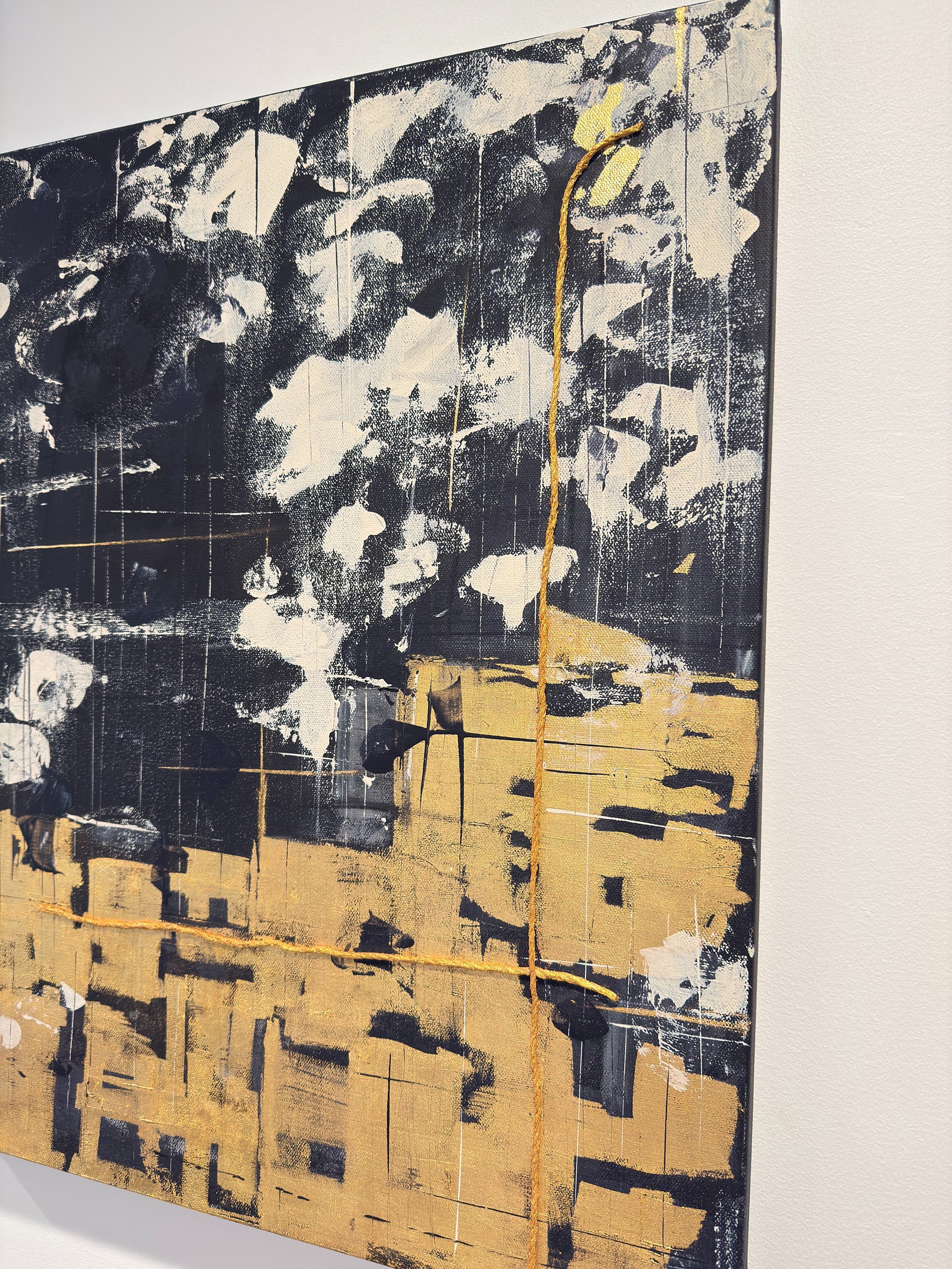 The fusion of acrylic, charcoal, and golden thread creates a dialogue between softness and intensity, memory and evolution.
